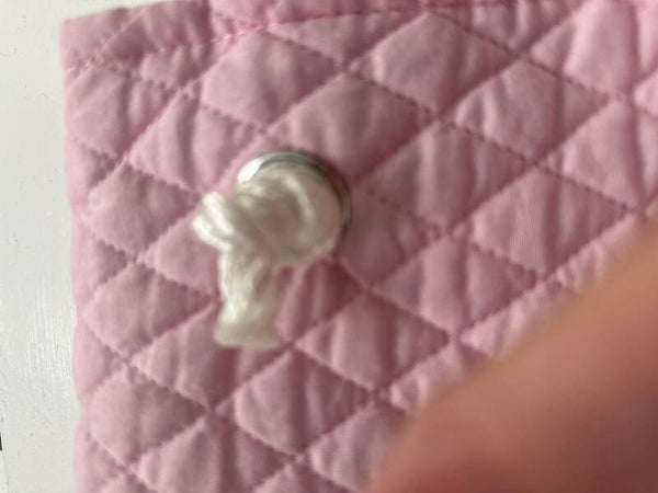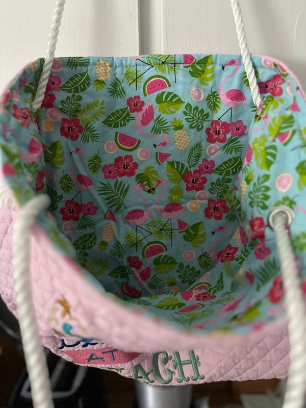 The bag is crafted with 100% quilted cotton fabric in a lovely pink and is fully lined with a complimentary cotton fabric which makes this bag easy to care for. The double handle is twisted white rope which is then threaded through silver tone grommets to ensure easy carrying.