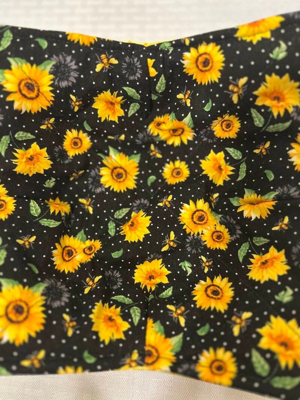 The bright yellow sunflowers and bees really POP on the black background fabric and the back side is bright yellow showing bees, flowers and honeycomb. So these cozies are reversible! It's like getting 2 for the price of 1!!