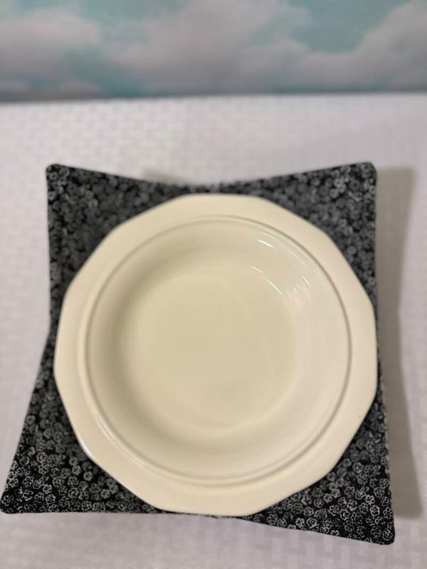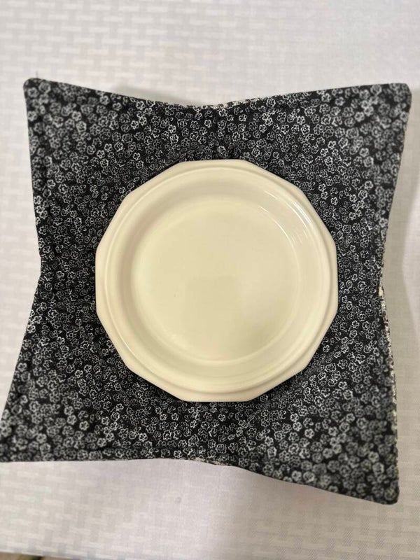You'll never burn your fingers again and you'll wonder how you ever survived without this cozie! My cozies are made with ALL 100% cotton fabric and thread plus the microwave safe batting is Wrap and Zap which is made exclusively for use in microwaves. One side if the cozie is black with a tiny white floral design. The colors are reversed on the other side meaning a white background with the floral design done in black. This cozie is great for people that don't want to use patterns or brighter colors or whose decor is black and white. All our cozies are reversible so it's like getting 2 for the price of 1!!